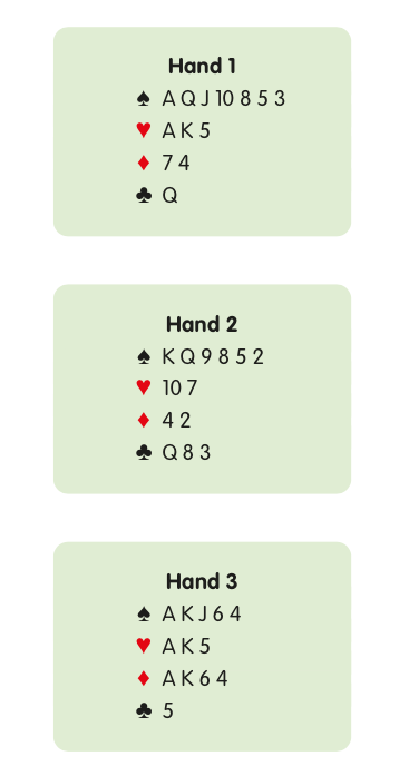 With Hand 1, you open 2♣ intending to rebid 2♠ to show the same as an Acol two in spades. With Hand 2, you open 2♠, weak. With Hand 3, where you would have opened an Acol 2♣, you open 2♦, the big bid in Benjamin.
