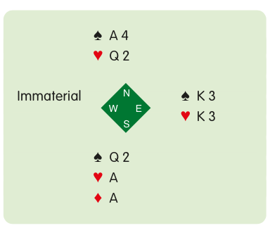 South leads the ♦A and discards the ♠4 from dummy. Both the hearts and spades are now blocked but South can unblock whichever suit East discards and use the other suit as an entry to the then established queen.
