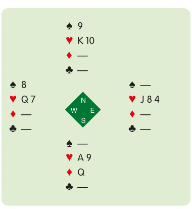 Hearts are trumps, and South, declarer, leads the ♠9 from dummy. East ruffs and South will overruff. If East ruffs with the ♥J, South ruffs with the ♥A, and finesses the ♥10. If East trumps with a lower card, South ruffs with the ♥9 and takes the top two trumps for the final two tricks.