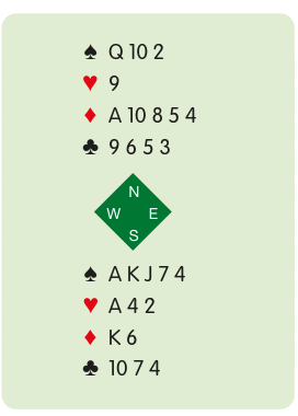 On the layout above, you should draw trumps and run the diamonds. Drawing trumps is essential to stop someone from ruffing one of your diamond winners.