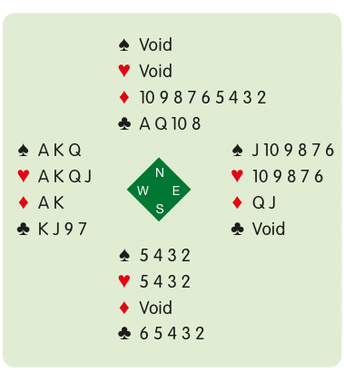 His opponents bet that he would not make a single trick in his hand. According to the story, he accepted the bet and lost all thirteen tricks. The complete deal was: