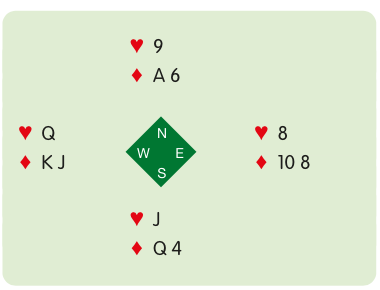 If he leads a diamond, West will win two tricks. Instead, he uses an ‘endplay’ by putting West on lead with the ♥Q. West is now ‘endplayed’, forced to lead diamonds, conceding the last two tricks.