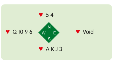 You cash the ace of hearts and find East now void. You then ‘exit’ with a low heart leaving West to return a heart into your tenace.