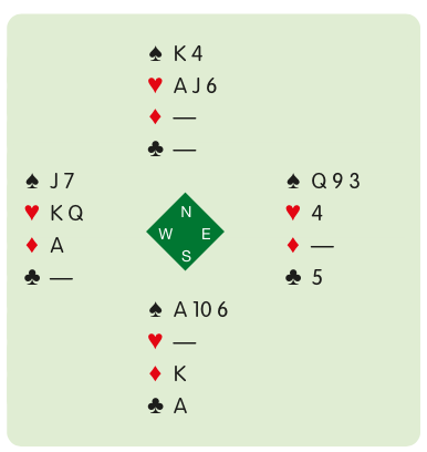 South leads the ♣A, squeezing West in three suits. He has stoppers in hearts and diamonds and a partial guard in spades. To avoid giving away a certain trick, he discards a spade. This enables South to play spades and take the finesse against East on the second round.