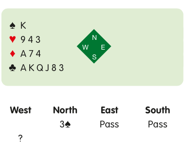 The options here are 3NT, 4♣ and double. Although you do not have a certain spade stopper, you need far less help from partner to make 3NT than 5♣ or 4♥. In any case, North is most unlikely to lead the ♠A. Bid 3NT.