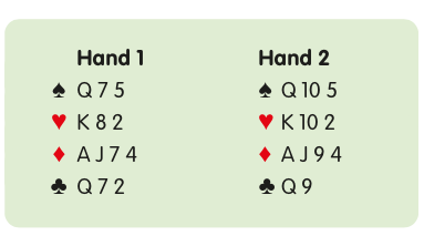 If partner shows a balanced 12-14, you would merely invite game with Hand 1 (no tens or nines) but bid 3NT with Hand 2 (two tens and two nines).