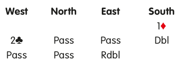 On this auction, East’s Kock-Werner redouble asks West to bid again. East is going to have a singleton or void in clubs and at least five cards in each major.