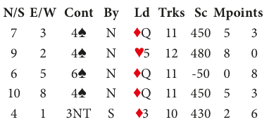 Pair 9, who played N/S against pair 2, achieved a top score. Having beaten all the other 4 N/S scores, they get 8 matchpoints. Pair 7 gets 5 matchpoints; they get 4 matchpoints for beating two scores (the 430 and -50) and 1 matchpoint for tying with pair 10’s 450. Pair 4 scores 2 matchpoints. They beat the -50 but lost to all the other pairs.