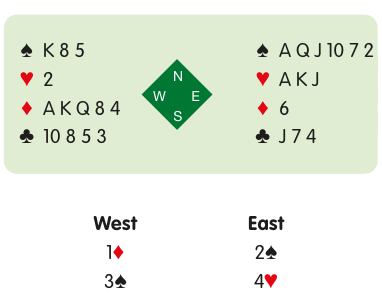 East’s 4 shows first- or second round control of hearts and, just as importantly, denies first- or second- round control of clubs (East would make the cheaper cue bid of 4♣ if holding a club control). This enables the players to stop safely in 4♠.