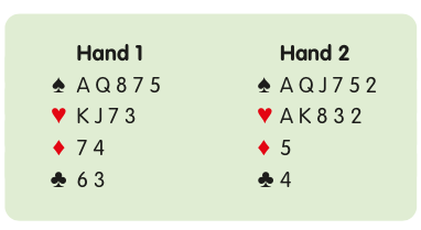 The first hand has nineteen opening points (10 in high cards, 5 for the spade length and 4 for the heart length). The second hand has twenty-five (14 HCP, 6 spades and 5 hearts).