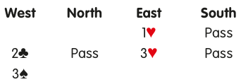 A spade contract is unlikely to be best – East has shown six good hearts and, by not rebidding 2♠ despite having the strength to reverse, has denied four spades. Therefore, West’s 3♠ agrees hearts and shows a spade control. Depending upon the partnership style, the control may be first round (ace or void) or second round (king or singleton).
