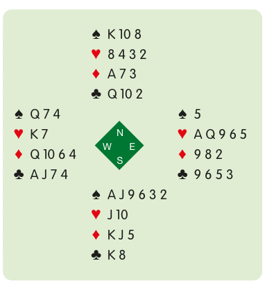 Counting the missing points then enables you to place the rest of the high cards. You place West with the ♠Q, the ♦Q and the ♣A-J. This tells you to ruff with the ace, finesse West for the ♠Q and then finesse in clubs rather than diamonds.