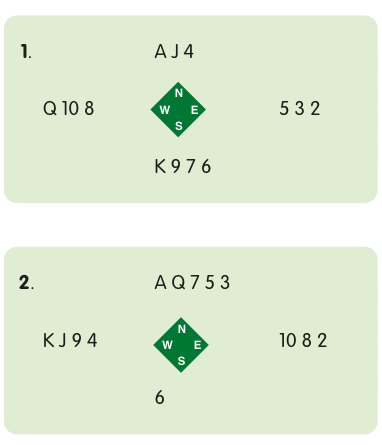 In 2, this is a side suit in a trump contract. If declarer finesses dummy’s queen and cashes the ace, West should drop the king.