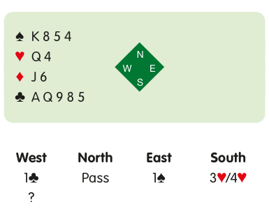 You would have bid only 2♠ if South had passed, so you should bid 3♠ over 3♥ but not 4♠ over 4♥.