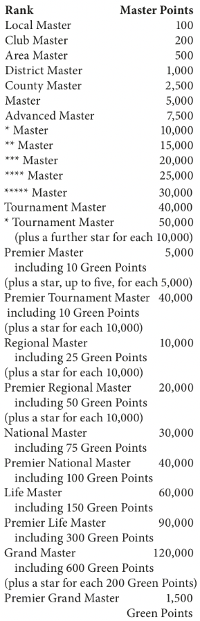 The English Bridge Union Ranking System works on Master Points accumulated as below.
