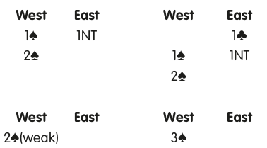 In each sequence, West is suggesting a single-suited spade hand. The first three sequences suggest a six-card suit, the fourth a seven-card suit.
