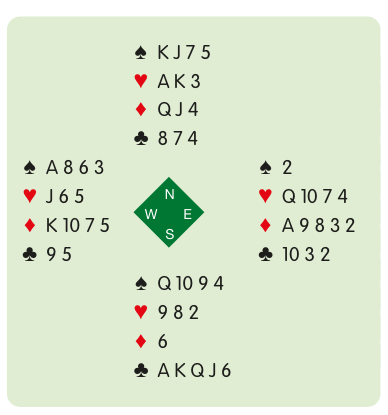 South plays in 4♠. West leads the 5. East wins with the A and returns the 3.
