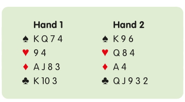 An opening bid of 1NT showing 12-14 points and a balanced hand. Playing a weak no-trump, you open 1NT on hands like these: